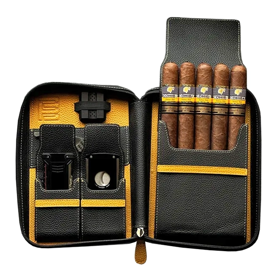 Introducing the “Black Mustard” Cigar Travel Case — a bold, modern design crafted for today’s cigar aficionado. Made from premium top-grain leather, it offers a durable yet sophisticated feel. Features include a collapsible cigar pocket, dual accessory storage, slots for tools and rests, a Boveda humidity sleeve, and a rubber-sealed zip for optimal freshness. The perfect mix of form, function, and elegance for travel. (Accessories and cigars not included.)