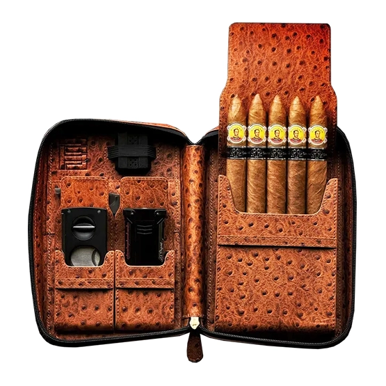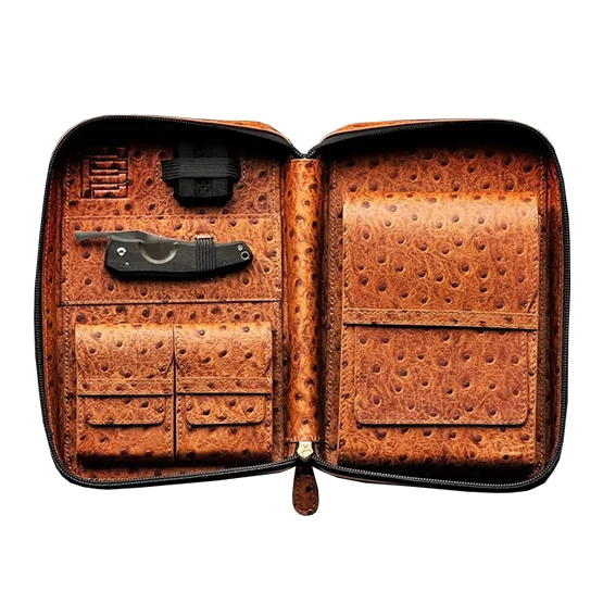Introducing the “Tan Ostrich” Cigar Travel Case — a refined and functional design made for today’s cigar aficionado. Crafted from premium top-grain leather with a unique ostrich texture, it offers durability and elegance. Features include a collapsible cigar pocket, dual accessory storage, tool and rest slots, a Boveda humidity sleeve, and a rubber-sealed zip to retain freshness. The perfect balance of style, protection, and practicality. (Accessories and cigars not included.)